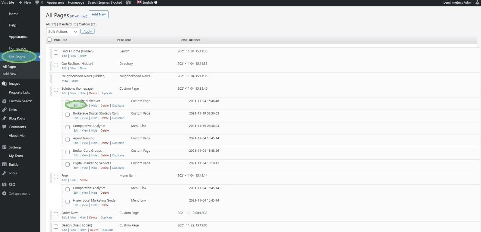 In order to edit page-specific SEO, navigate to “Site Pages” on the side menu and click “Edit” on the page you want to make changes to.