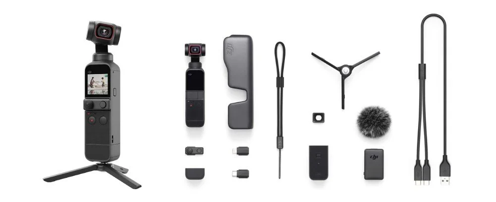 The Pocket-Sized Intelligent Camera features a 3-axis Stabilized Camera, ActiveTrack 3.0, Al Editor, High-Quality Images, and DJI Matrix Stereo. The Pocket 2 Combo includes additional accessories such as a Carrying Case, Wide-Angle Lens, Do-It-All Handle, and more.